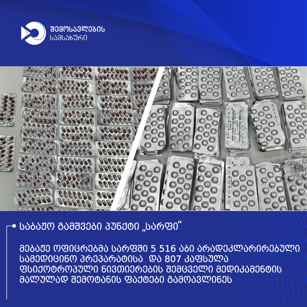 ფინანსთა სამინისტროს შემოსავლების სამსახურის მებაჟე ოფიცრებმა, ეჭვის საფუძველზე, უცხო ქვეყნის მოქალაქეების ხელბარგისა და სატრანსპორტო საშუალების დათვალიერების შედეგად, 807 კაფსულა ფსიქოტროპული ნივთიერების შემცველი მედიკამენტი და 5 516 აბი არადეკლარირებული სამედიცინო პრეპარატი გამოავლინეს.