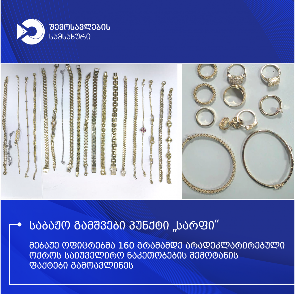 ფინანსთა სამინისტროს შემოსავლების სამსახურის საბაჟო გამშვებ პუნქტში ,,სარფი", კანონდარღვევის 2 ფაქტი აღიკვეთა. კერძოდ, მებაჟე ოფიცრებმა ეჭვის საფუძველზე, უცხო ქვეყნის მოქალაქეების, როგორც ფიზიკური, ასევე კუთვნილი ბარგის დეტალური დათვალიერების შედეგად, ჯამში 160 გრამამდე არადეკლარირებული ოქროს საიუველირო ნაკეთობები აღმოაჩინეს.