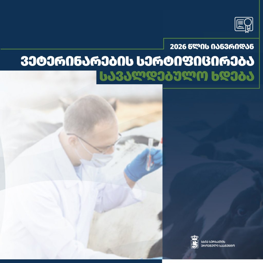 საქართველოს მთავრობის №288 დადგენილების „ვეტერინარისა და ვეტერინარი ტექნიკოსის საქმიანობისთვის სახელმწიფო სასერტიფიკატო გამოცდის ჩატარებისა და მათი პროფესიული განვითარების წესისა და პირობების დამტკიცების შესახებ" შესაბამისად, 2026 წლის პირველი იანვრიდან, ვეტერინარის საქმიანობა სახელმწიფო სერტიფიკატის გარეშე აიკრძალება.