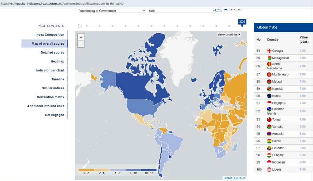 ევროკომისიამ ფრიდომ ჰაუსის 2025 წლის ანგარიშის ფარგლებში, მთავრობების ფუქციონირების გლობალური შეფასება გამოაქვეყნა. ინდექსი მოიცავს მსოფლიოს 200 ზე მეტი ქვეყნისა და ტერიტორიის შესახებ ანალიზს 2013 წლიდან 2025 წლამდე პერიოდში. კვლევის მიზანი იყო, 12 ბალიანი სისტემით შეეფასებინა მთავრობის ფუქციონირება, დემოკრატიულ კონტექსტში, კერძოდ: „არჩეული თანამდებობის პირების შესაძლებლობა ეფექტიანად და ანგარიშვალდებულად განახორციელონ მმართველობა ზედმეტი ჩარევების გარეშე“.