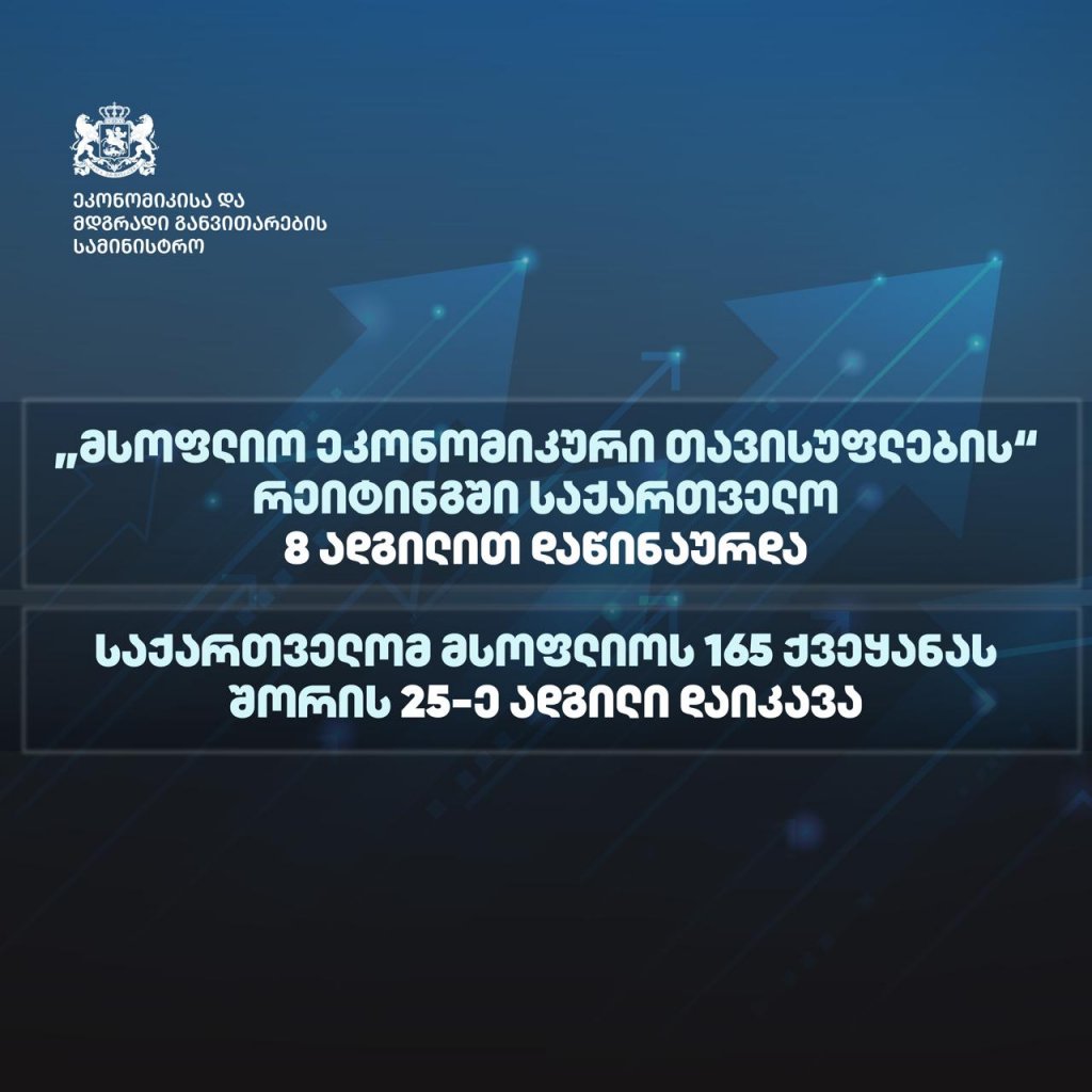 2025 წელს „მსოფლიო ეკონომიკური თავისუფლების" რეიტინგში საქართველო 8 ადგილით დაწინაურდა და მსოფლიოს 165 ქვეყანას შორის, 7,69 ქულით, 25-ე ადგილი დაიკავა. აღსანიშნავია, რომ საქართველომ რეიტინგში, ორივე - როგორც პოზიცია, ასევე ქულა გაიუმჯობესა.