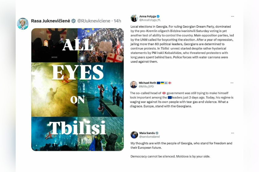 ხელისუფლების დამხობის მოთხოვნით მიმდინარე აქციას მხარდაჭერა გამოუცხადა ლიეტუვის პარლამენტის წევრმა და თავდაცვის ყოფილმა მინისტრმა ლაურინას კაშჩუნასმა, რომელმაც X-ზე დაწერა: "სამშობლოს კავშირი - ლიეტუველი ქრისტიან-დემოკრატები" დღეს ქართველებს უდგანან გვერდში - სანამ რუსული გავლენისგან არ გათავისუფლდებით და ევროკავშირისა და ნატოს ნაწილი არ იქნებით".