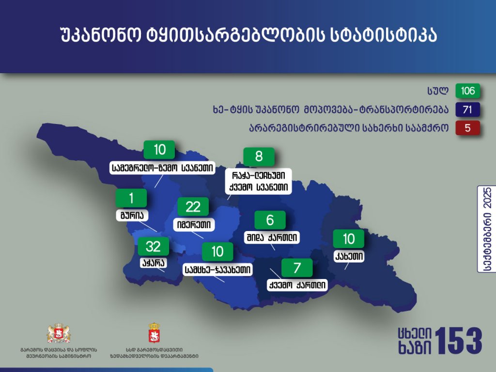 გარემოს დაცვისა და სოფლის მეურნეობის სამინისტროს გარემოსდაცვითი ზედამხედველობის დეპარტამენტის თანამშრომლებმა, 2025 წლის 01 სექტემბრიდან 30 სექტემბრის ჩათვლით, უკანონო ტყითსარგებლობის 106 ფაქტი გამოავლინეს. მათ შორის 71 ხე-ტყის უკანონო მოპოვება-ტრანსპორტირებას ეხება, 35 კი, სახერხი საამქროების მიერ ტექნიკური რეგლამენტის დარღვევისა და უკანონო სახერხი საამქროების ფაქტებია. სამართალდარღვევებიდან 13 ფაქტი სისხლის სამართლის დანაშაულის ნიშნებს შეიცავს და მასალები, შემდგომი რეაგირების მიზნით, შესაბამის უწყებებში გადაიგზავნა.