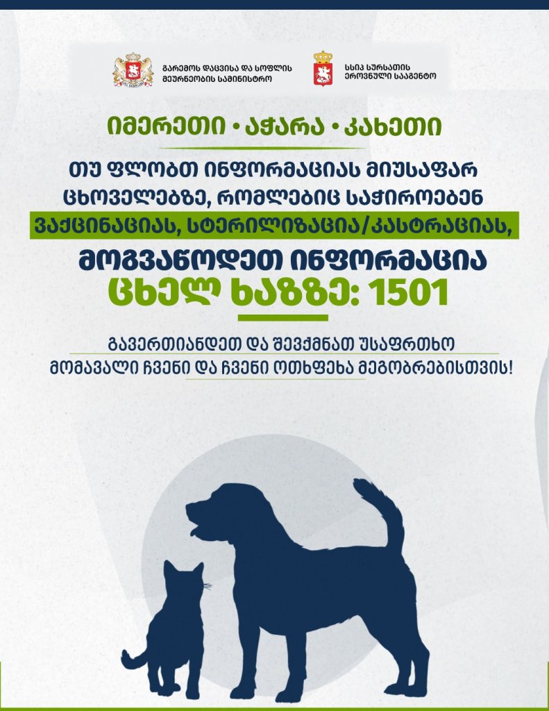 მიუსაფარი და მიკედლებული ცხოველების პოპულაციის მართვის საპილოტე პროგრამის ფარგლებში, 29 ივლისიდან 15 ოქტომბრის ჩათვლით, აჭარის, იმერეთის, კახეთის რეგიონებში, სპეციალური ეკიპაჟების მიერ თავშესაფრებში გადაყვანილია 3761 ცხოველი.