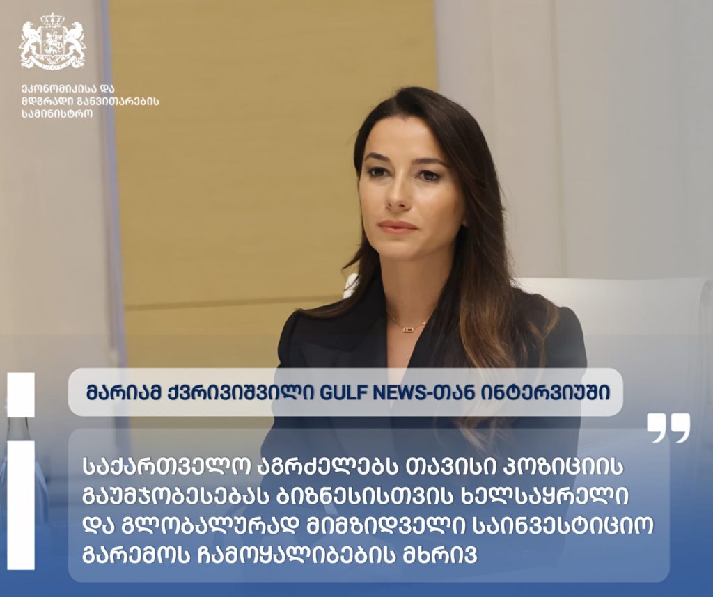 2025 წელიც მნიშვნელოვანი ეკონომიკური აქტივობით დაიწყო: იანვარ-აგვისტოში 7,9%-იანი ეკონომიკური ზრდა დაფიქსირდა," - განაცხადა ეკონომიკისა და მდგრადი განვითარების მინისტრმა მარიამ ქვრივიშვილმა არაბთა გაერთიანებული საამიროების გამოცემა Gulf News - სთან ინტერვიუში.