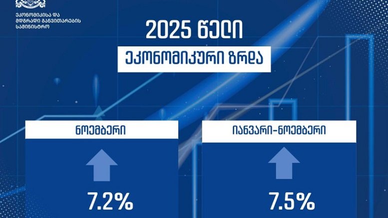 2025 წლის ნოემბერში საქართველოს ეკონომიკა 7.2%-ით გაიზარდა. 2025 წლის იანვარ-ნოემბრის საშუალო ეკონომიკური ზრდა 7.5%-ით განისაზღვრა. ინფორმაციას ეკონომიკის სამინისტრო ავრცელებს.