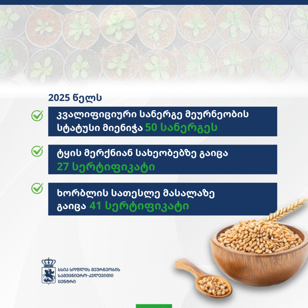 ასევე, 2019–2025 წლების მონაცემებით, ეროვნულ კატალოგში შეტანილია 109 ჯიში, მათ შორის ხორბლის, ვაზის, ქერისა და შვრიის კულტურები, რაც ხელს უწყობს სერტიფიცირებული სათესლე და სარგავი მასალის წარმოების განვითარებასა და აგროსექტორის მდგრადობას.