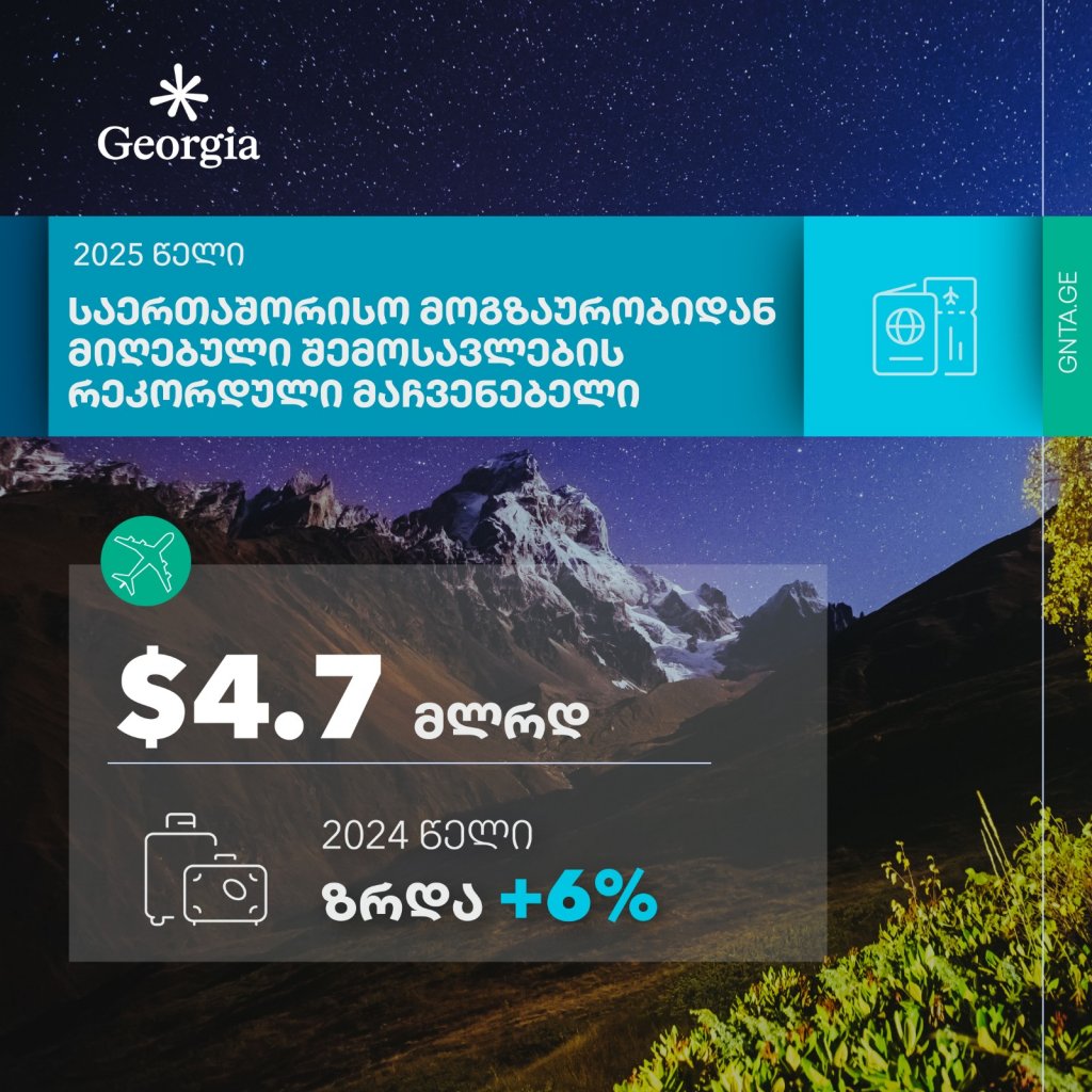 2025 წელს მნიშვნელოვნად გაიზარდა ტურიზმიდან მიღებული შემოსავლები ისრაელიდან (34.3%-ით); ევროკავშირიდან და გაერთიანებული სამეფოდან (15.6%-ით), აზერბაიჯანიდან (32.5%-ით), საუდის არაბეთიდან (15.8%-ით), სომხეთიდან (7.7%-ით) და სხვა ქვეყნებიდან.