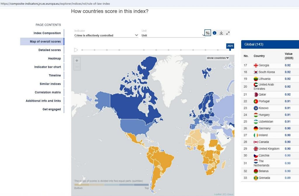 გამოკვლევის ფარგლებში, დანაშაულის კონტროლის ეფექტიანობის მსოფლიო რეიტინგიც გამოქვეყნდა, სადაც საქართველომ შეფასების 100-პროცენტიანი სისტემით 92 პროცენტი მიიღო და მსოფლიოს საუკეთესო ოცეულში მე-17 ადგილზე გავიდა. საქართველო უსწრებს ევროკავშირის და ნატოს წევრ 23 სახელმწიფოს და სხვა არაერთ განვითარებულ ქვეყანას: გერმანიას, იტალიას, საფრანგეთს, დიდ ბრიტანეთს, შეერთებულ შტატებს, კანადას, ესპანეთს, ბელგიას, ირლანდიას, პორტუგალიას, ლიეტუვას, ლატვიას, კვიპროსს, უნგრეთს, ჩეხეთს, ალბანეთს, ბულგარეთს, ავსტრალიას, ახალ ზელანდიას, სამხრეთ კორეას, საბერძნეთს, სლოვაკეთს, მალტას, ჩრდილოეთ მაკედონიას, თურქეთს, ალბანეთს.