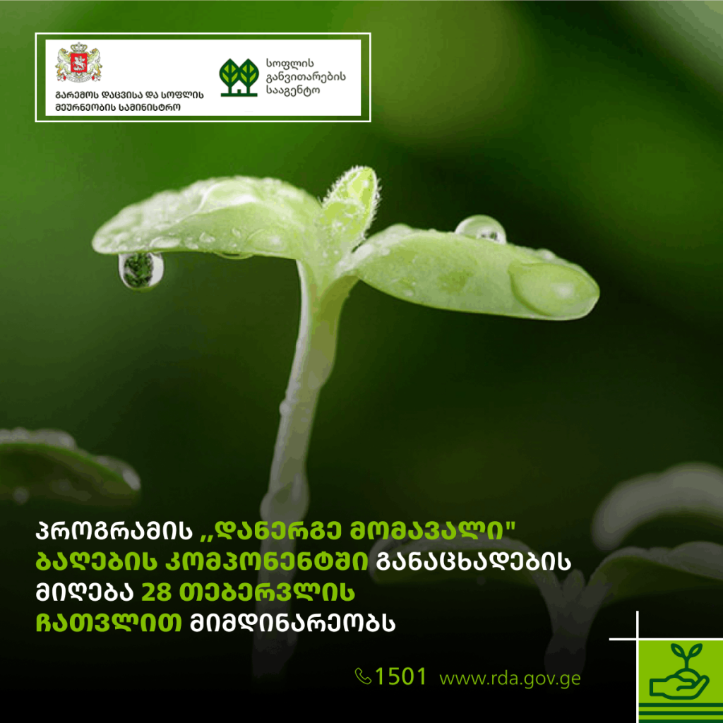 პროგრამაში განაცხადების მიიღება ელექტრონულად, სოფლის განვითარების სააგენტოს ოფიციალურ ვებგვერდზე www.rda.gov.ge.
