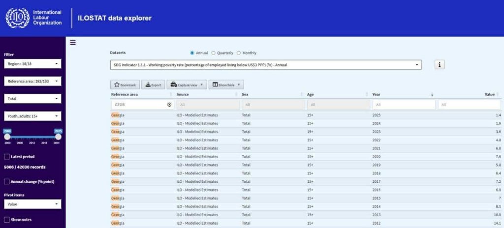 ორგანიზაციამ გამოაქვეყნა 2000 წლიდან 2024 წლის ჩათვლით მაჩვენებლები. ირკვევა, რომ საქართველოში სამუშაო სიღარიბის მკვეთრი შემცირება 2012 წლიდან დაიწყო. 2000-2003 წლებში სიღარიბის საერთაშორისო ზღვარს მიღმა საშუალოდ იყო დასაქმებულთა 19%, ვითარება პრაქტიკულად არ შეცვლილა 2004-2012 წლებში, რა დროსაც 17% ანუ საშუალოდ ყოველი მეექვსე დასაქმებული, სიღარიბის საერთაშორისო ზღვარს მიღმა იმყოფებოდა.