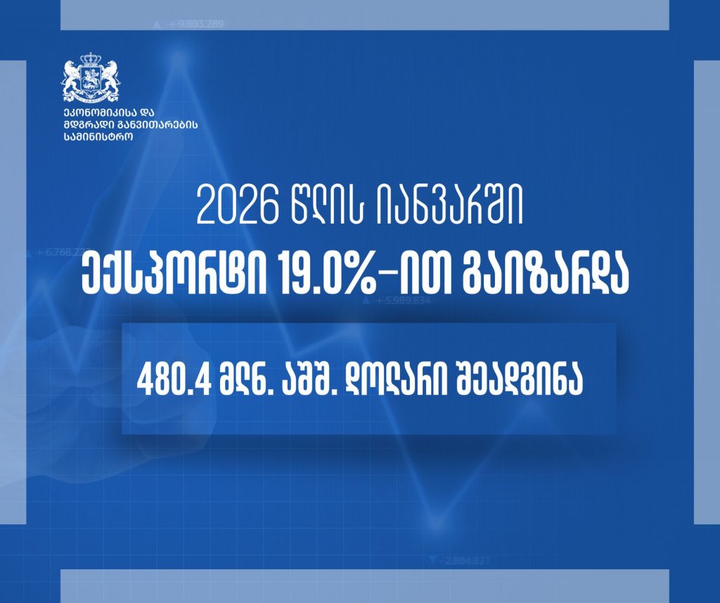 2026 წლის იანვარში ექსპორტი, წინა წლის ანალოგიურ პერიოდთან შედარებით, 19%-ით გაიზარდა და 480.4 მლნ. აშშ დოლარი შეადგინა.