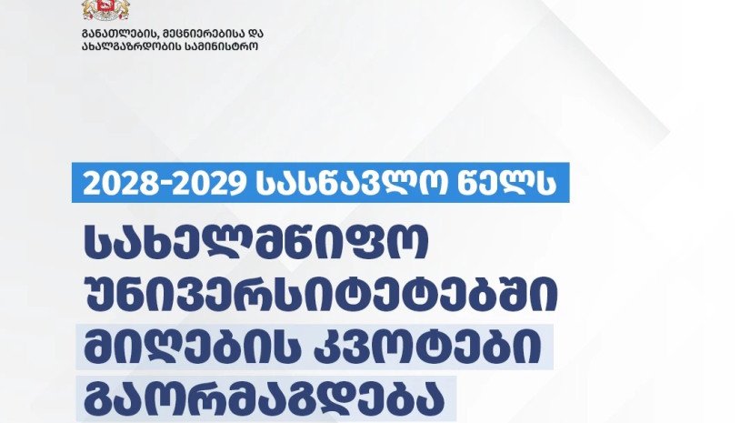 საქართველოს მთავრობის გადაწყვეტილებით, 2028-2029 სასწავლო წელს სახელმწიფო უნივერსიტეტებში სტუდენტთა მიღების კვოტები გაორმაგდება, ვინაიდან მე-11 და მე-12 კლასების მოსწავლეები სკოლებში სწავლას ერთდროულად დაასრულებენ. ინფორმაციას განათლების სამინისტრო ავრცელებს.